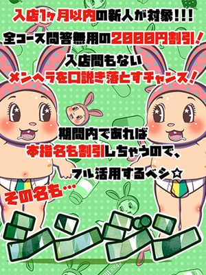 ・入店1ヶ月以内、全員対象! ・問答無用で2000円割引ッッッ!!! ・期間内なら本指名様も適応可能☆ ・デビューしたてのメンヘラChanを、 ・手懐ける絶好のチャンス!!! ・メンヘラは会った数だけ懐いてくれる… ・この期間を見逃すナッッッ!!! その名も… 【シンジン】 新人限定イベント! 入店1ヶ月以内なら… 何度でも利用可能だゼ!? ぶっちゃけ赤字だゼ!?!? それでもメンヘラ好きな皆様の為に、 文字通り出血大サービス☆ 該当してる子は写真にロゴが入ってるから 要チェックすべしッッッ!!! 受付時に 「シンジン」 とお伝え下され☆